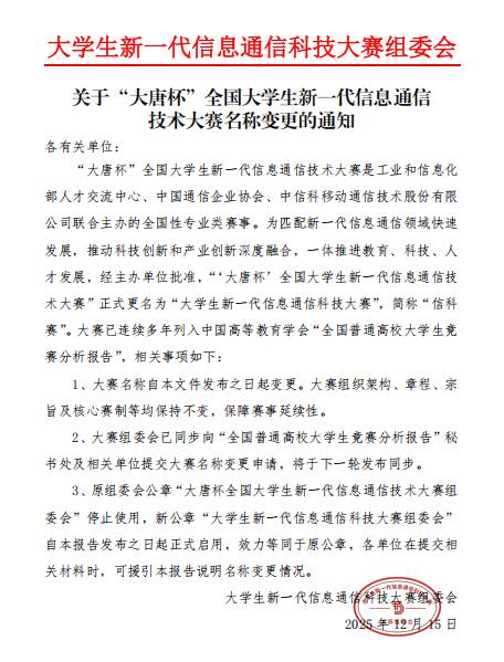 关于组织我校学生参加2026年第十三届大学生新一代信息通信科技大赛(原“大唐杯”全国大学生新一代信息通信技术大赛)的通知